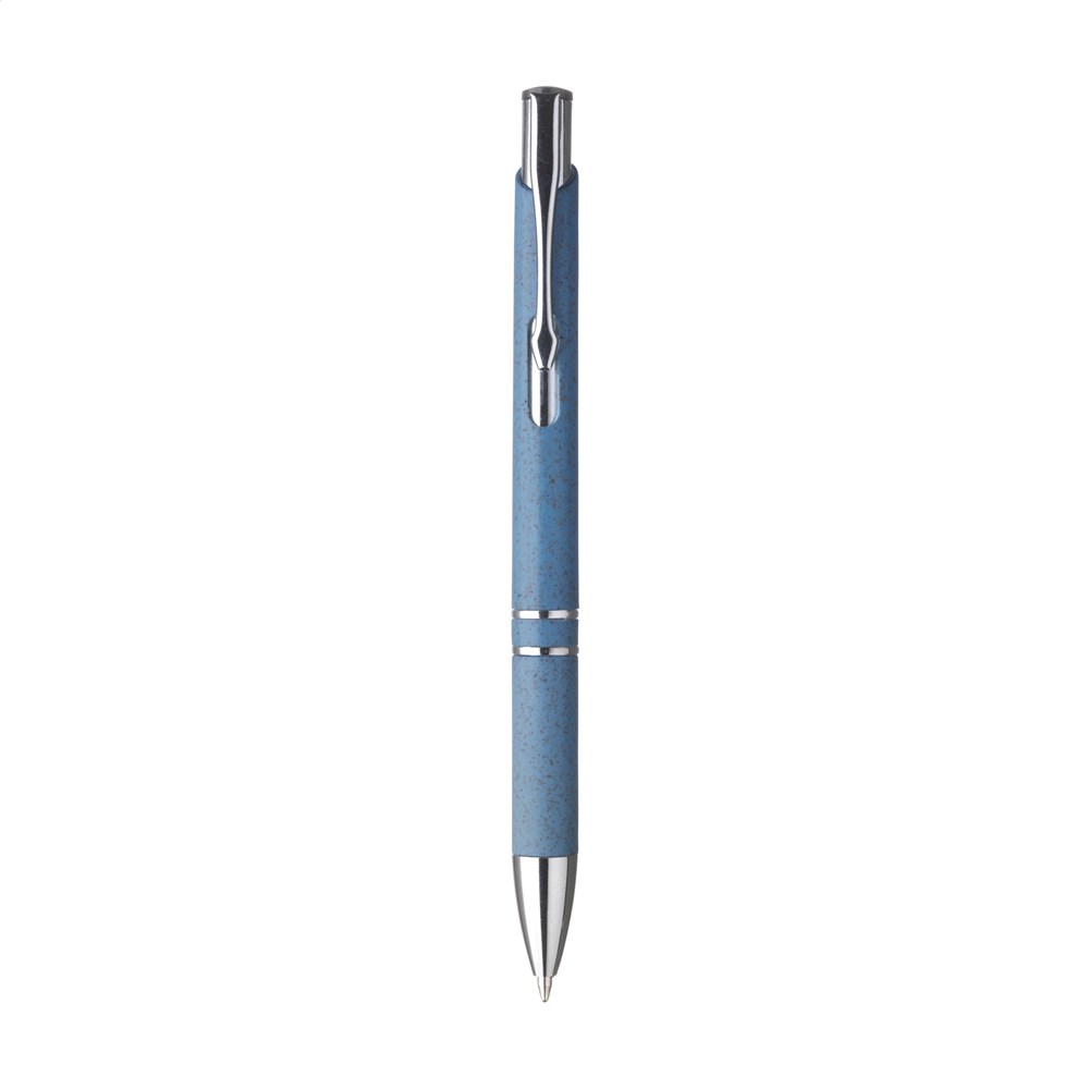 Blauschreibender Kugelschreiber mit Gehäuse aus 50% ABS und 50% Weizenstroh, Metallclip und Chromakzenten aus Kunststoff.