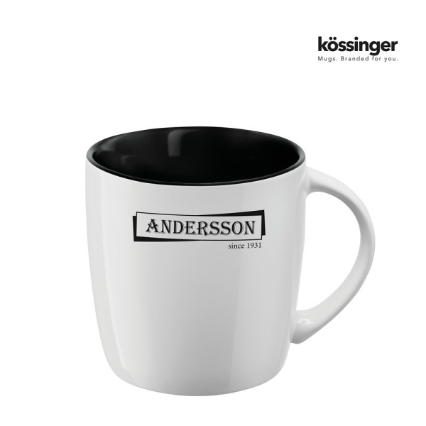 Kössinger Tasse Ennia inside - Außen:weiß, Innen: farbig. Die äußerst beliebte Werbetasse aus Keramik, überzeugt mit moderner, klarer Form. Besonderer Blickfang ist die mattschwarze Außenglasur. Serie Ennia mit verschiedenen Innen-und Außenfarben bietet über den Nutzwert und die Langlebigkeit des Artikels hinaus die Möglichkeit, Sammeltassen zu gestalten.