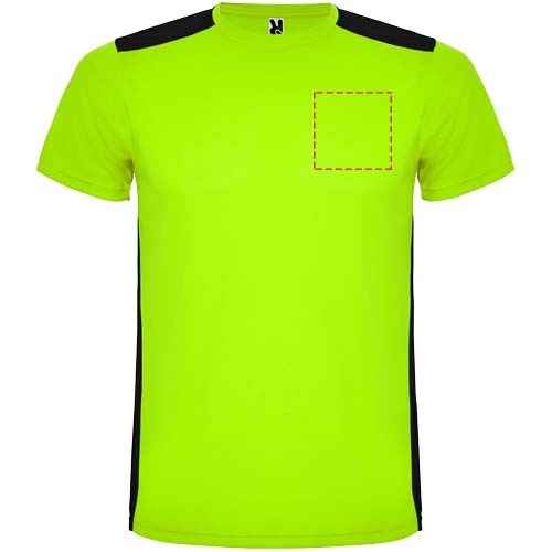 Funktions-T-Shirt aus atmungsaktivem Stoff. Rundhalsausschnitt. Kombination aus zwei Polyestergeweben im Rücken- und Schulterbereich. Polyester Bienenwabe Vorne und 3D-Netz Polyester auf Schulter und Rücken. Material ist feuchtigkeitabsorbierend. Ziernähte auf den Schultern und Seiten. Schnitt mit verlängertem Rückenteil. Abnehmbares Etikett.