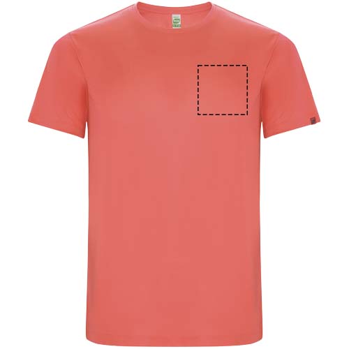 Funktions-T-Shirt aus recyceltem Polyester CONTROL DRY. Rundhalsausschnitt mit farblich abgesetzten Nähten. ECO-Logo-Etikett am Ärmel. Verpackung aus Recyclingmaterial. Herausnehmbares ECO-Etikett. Verpackung aus Recyclingmaterial. Technisches Gewebe. Das Modell ist 180 cm groß und trägt Größe M.