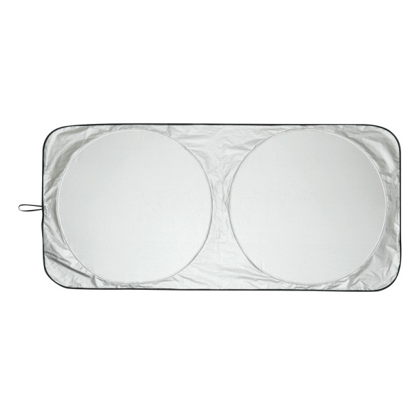 Auto-Sonnenschutz SUN SHIELD: silberne Oberfläche mit schwarzer Rückseite, bei Nichtgebrauch durch Gummischlaufe platzsparend faltbar, inkl. Aufbewahrungstasche