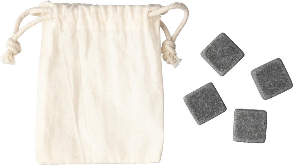 Eiswürfel aus Stein, Satz von 4 wiederverwendbaren Natursteinen. Steine müssen zum Abkühlen in den Kühlschrank gestellt werden. Verpackt in einem Baumwollbeutel mit Kordelzug.