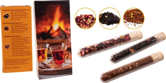 Inhalt: ca. 4 g Schwarztee Advent, ca. 4 g Rooibuschtee Pfeffernuss-Orange, ca. 4 g Weihnachts-Früchtetee