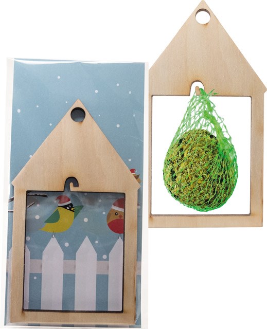 Das Vogelhäuschen aus Holz lässt sich überall aufhängen und mit einem Meisenknödel bestücken. Bald schon können die Vögel bei Ihrem Festmahl beobachtet werden. Die Karte kann mit Ihrem Eindruck versehen oder, ebenfalls ab 250 Stück, individuell gestaltet werden. Inhalt: Vogelhäuschen aus Holz (ohne Meisenknödel)