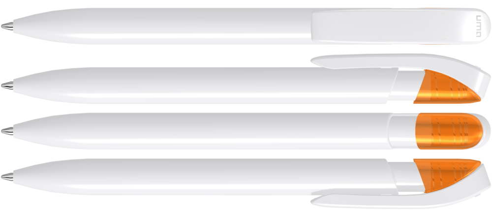 Druckkugelschreiber mit gedeckt glänzendem Gehäuse in uni weiß oder schwarz und farbig transparent glänzende Manschette.