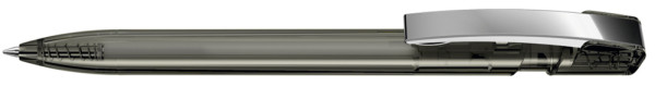 Druckkugelschreiber mit transparent glänzendem Gehäuse und flexiblem Metallclip glanzverchromt.