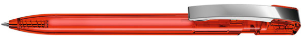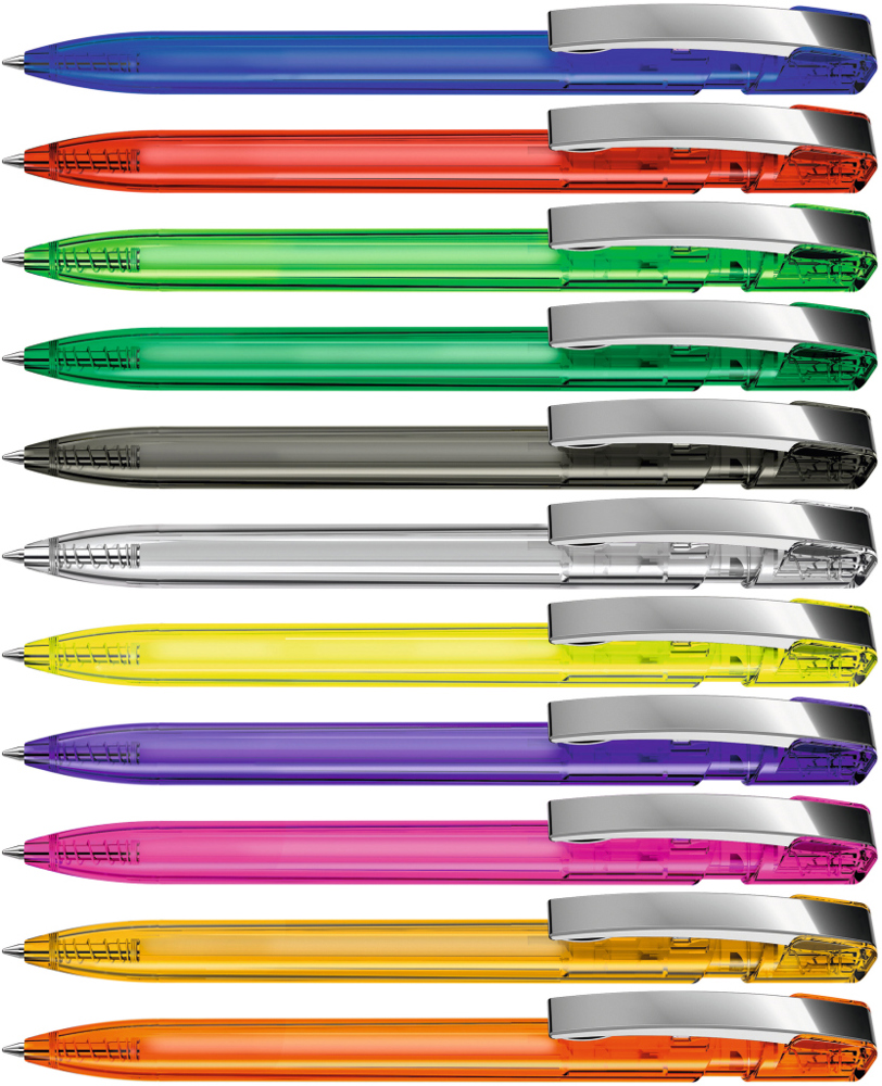 Druckkugelschreiber mit transparent glänzendem Gehäuse und flexiblem Metallclip glanzverchromt. mehr