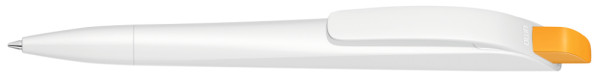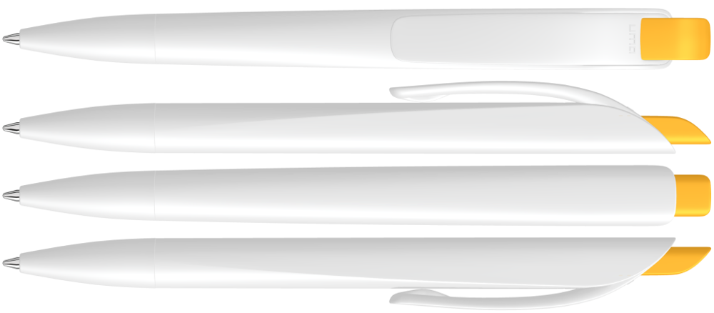 Druckkugelschreiber mit geometrisch wechselnder Schaftform. Gehäuse gedeckt matt schwarz oder weiß mit Bogenclip und farbigem Drücker.