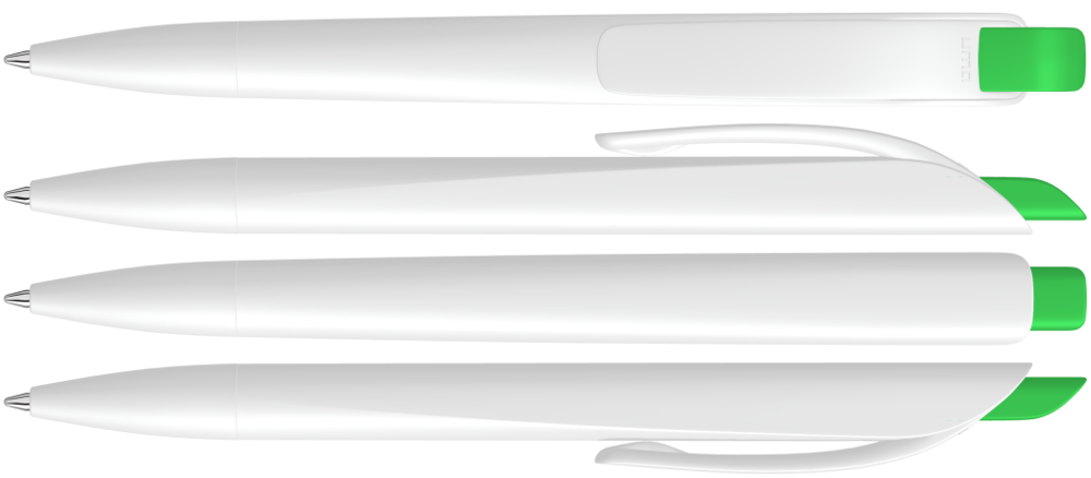 Druckkugelschreiber mit geometrisch wechselnder Schaftform. Gehäuse gedeckt matt schwarz oder weiß mit Bogenclip und farbigem Drücker.