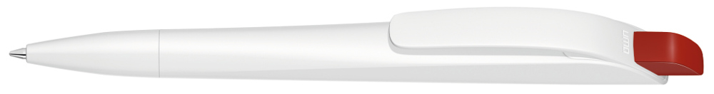 Druckkugelschreiber mit geometrisch wechselnder Schaftform. Gehäuse gedeckt matt schwarz oder weiß mit Bogenclip und farbigem Drücker.