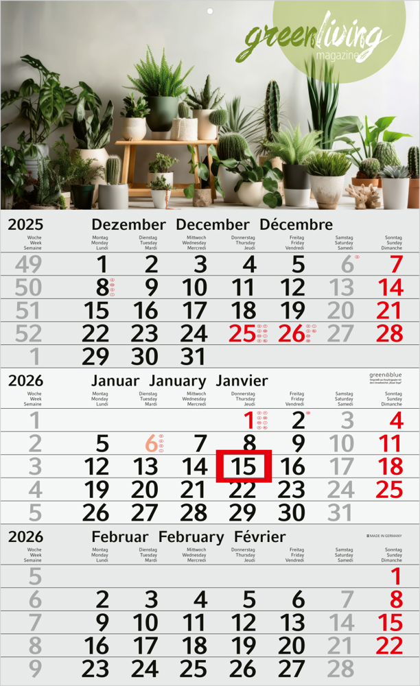 Der Budget 3 green+blue ist ein 3-Monatskalender, der durch nachhaltige Materialien und modernes Design überzeugt. Das Kalendarium besteht aus Recyclingpapier mit dem Umweltzeichen „Blauer Engel“. Mit einer großzügigen Werbefläche, die im 4C-Digitaldruck individuell gestaltet werden kann, eignet sich dieser Kalender ideal für Unternehmen, die ökologische Verantwortung und Werbewirkung verbinden möchten. • Format: 300 × 490 mm gesamt; 300 × 350 mm Kalendarium • Kalendarium: Deutsch 3sprachig D/GB/F hellgrau • Ausstattung: Datumsschieber rot • Material: Recyclingpapier – hergestellt aus 100 % Altpapier mit dem Umweltzeichen „Blauer Engel“ • Werbefläche: am Kopf • Druck: 4C-Quality Digital inklusive