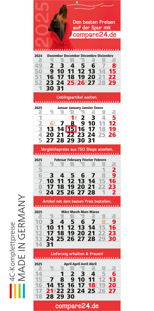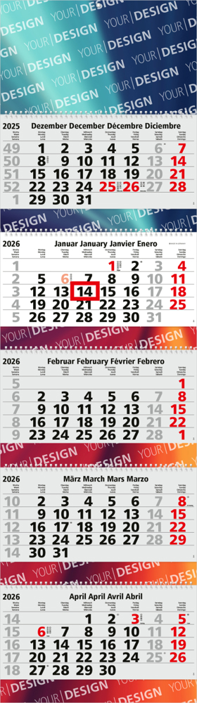 Der Grande Wire-O 5 Bestseller setzt Maßstäbe als großformatiger 5-Monatskalender. Dieses Premium-Modell kombiniert eine elegante Wire-O-Bindung mit einem großzügigen Layout, das sowohl Übersichtlichkeit als auch Werbewirksamkeit garantiert. Hergestellt in Deutschland – Qualität, auf die Verlass ist. • Format: 335 × 1.195 mm gesamt; 335 × 160 mm je Kalenderblock • Kalendarium: Deutsch 4sprachig D/GB/F/E hellgrau • Verarbeitung: weiße Wire-O-Bindung der Kalenderblocks; portooptimiert zu versenden; Aufhängeöse aus Metall • Werbefläche: Kopfleiste, Zwischenleisten, Fußleiste • Ausstattung: Datumsschieber rot • Druck: 4C-Quality Digital inklusive