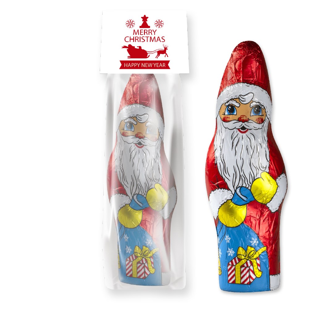 Schoko Weihnachtsmann, ca. 75g, Blockbodenbeutel mit Werbereiter