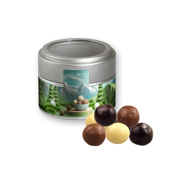 Knusperkugeln-Mix, ca. 45g, Metalldose Mini mit Sichtfenster silber