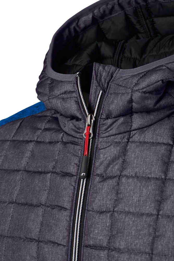 Weiches, wärmendes, pflegeleichtes Material in Melange-Optik Vorder-, Rückenteil und Kapuze in gestepptem Karodesign Kontrastfarbige Flatlocknähte am Ärmel Kapuze mit innenliegender Weitenregulierung Durchgehend hinterlegter Reißverschluss 2 seitliche Taschen mit Reißverschluss, 2 Innentaschen JN771: taillierter Schnitt 1/2 Oberweite: 53 cm Länge ab Schulter: 68 cm Ärmel Länge: 67 cm OEKO-TEX® Standard 100 (15.0.70467) Kapuze