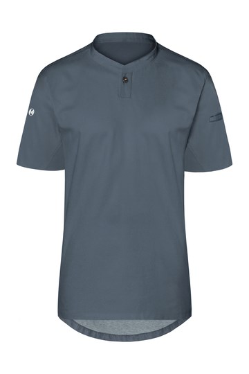 Vorderseite: Köpergewebe; Rückseite: Jersey-Piqué, atmungsaktiv und feuchtigkeitsregulierend | Modernes Arbeitsshirt mit kurzen Ärmeln im sportlich edlem Look | Tailliert geschnitten | Hohe Waschbarkeit | Halsausschnitt mit schmalem Stehkragen und kleiner Knopfleiste | Leistentasche am linkem Ärmel
