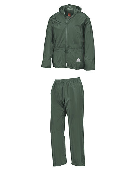 Wind- und wasserdicht (2.000 mm) | Außen: 190T 100% Polyester mit StormDri 2000 Beschichtung | Schweres Material, versiegelte Nähte | Kapuze mit Klettverschluss, durchgehender Reißverschluss vorne | Zwei geräumige Taschen an der Vorderseite der Jacke und zwei Eingriffe zu den Taschen der darunter getragenen Hose | Innenliegende Bündchen, Rückseite mit Netzlüftung | Verstellbarer Kordelzug im Bund der Jacke | Elastischer Hosenbund | Beinabschluss verstellbar durch Druckknopf | Reißverschluss-Beutel zum Verstauen | Sicherheitsdreiecke vorne und hinten mit reflektierenden Materialien