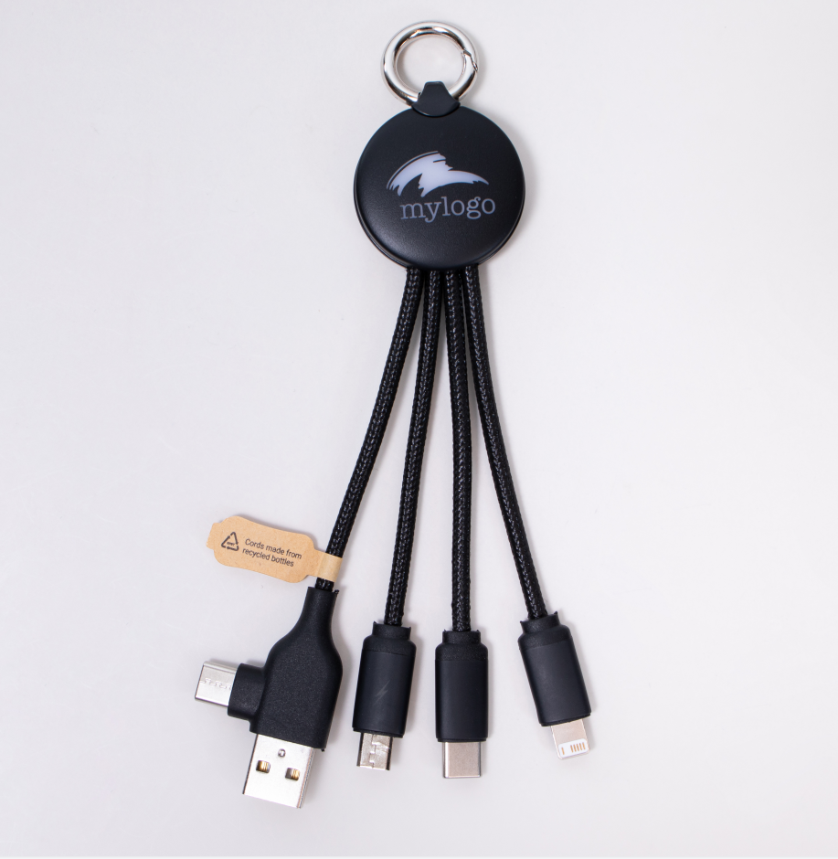 USB-Ladekabel aus recycelten PET-Flaschen mit beleuchteter Logofläche und Schlüsselring. Gleichzeitiges Laden von bis zu drei mobilen Geräten möglich. Optional mit NFC-Funktion zum automatischen Website-Aufruf (gegen Aufpreis). Anschlüsse Input: USB-C und beidseitig verwendbarer USB Anschluss, Anschlüsse Output: Micro-USB, USB-C, Apple. Länge: ca. 14,5 cm. Ladestrom: max. 2.4A. Verpackung: Kraftbox. Veredelung: Lasergravur an einer Position inklusive.