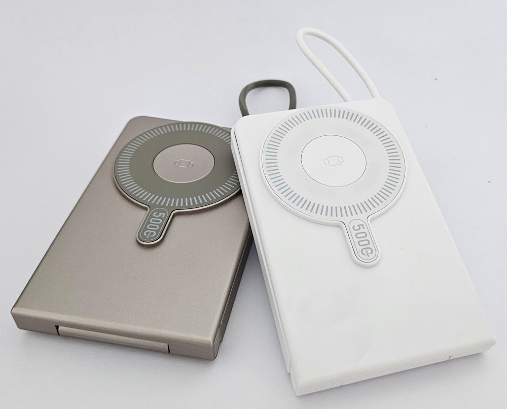Wireless-Powerbank mit magnetischer Ladefläche, aufstellbar, mit integriertem Ladekabel und Spiegel. Zur Haftung benötigt das Smartphone eine magnetische Rückseite oder ein magnetisches Ladecase. Kapazität: 5.000 mAh. Maße: ca. 112 x 69 x 13,5mm. Input USB-C Port: PD 18W. Input via integriertem USB-C Kabel: PD 18W. Output via Integriertem USB-C Kabel: PD 20W. Wireless Output: 15W für Smartphones, 2.5W für Watches, 3W für In Ears. Farben: weiß, schwarz, gold. Veredelung: 1c Druck an einer Position inklusive. Verpackung: weiße Faltschachtel.