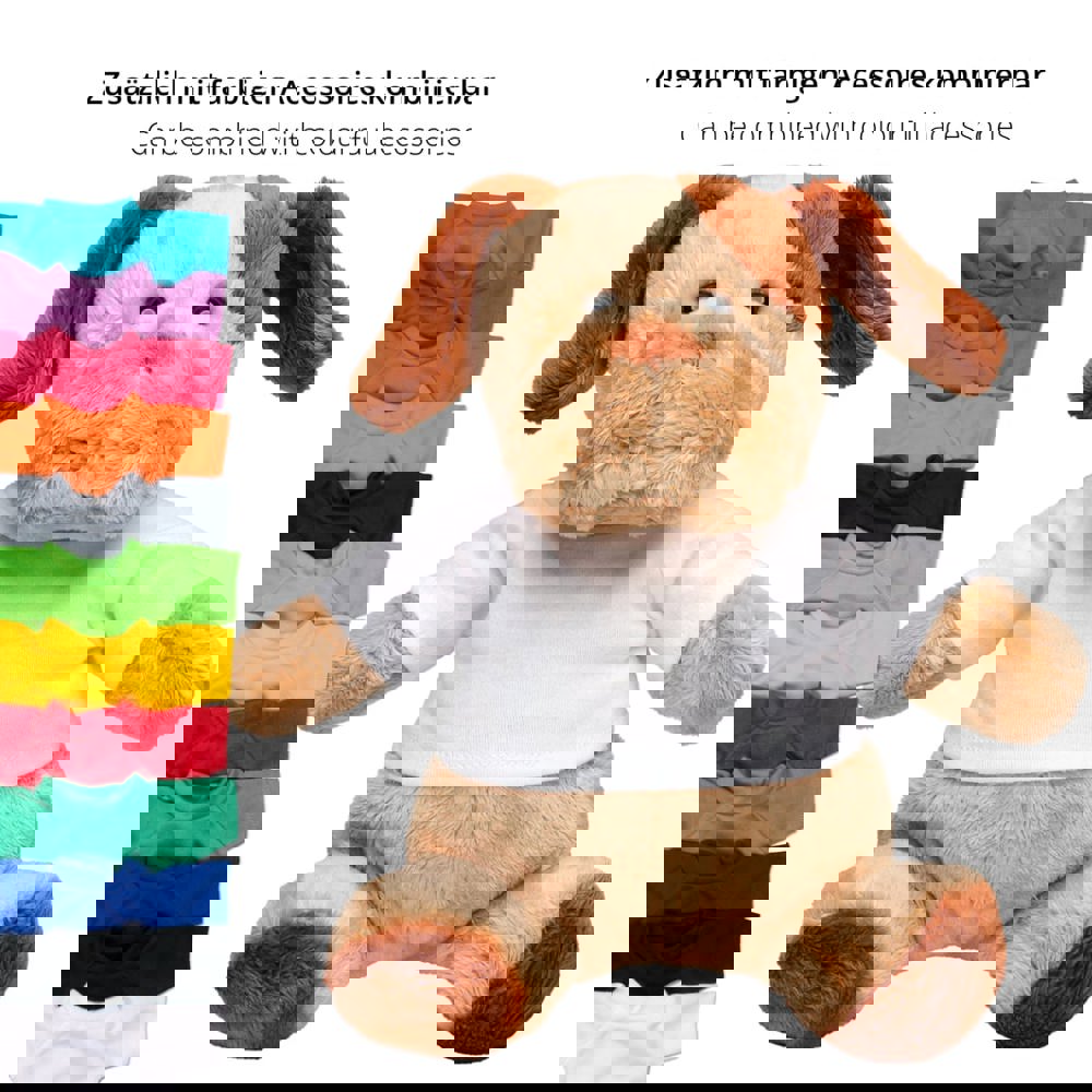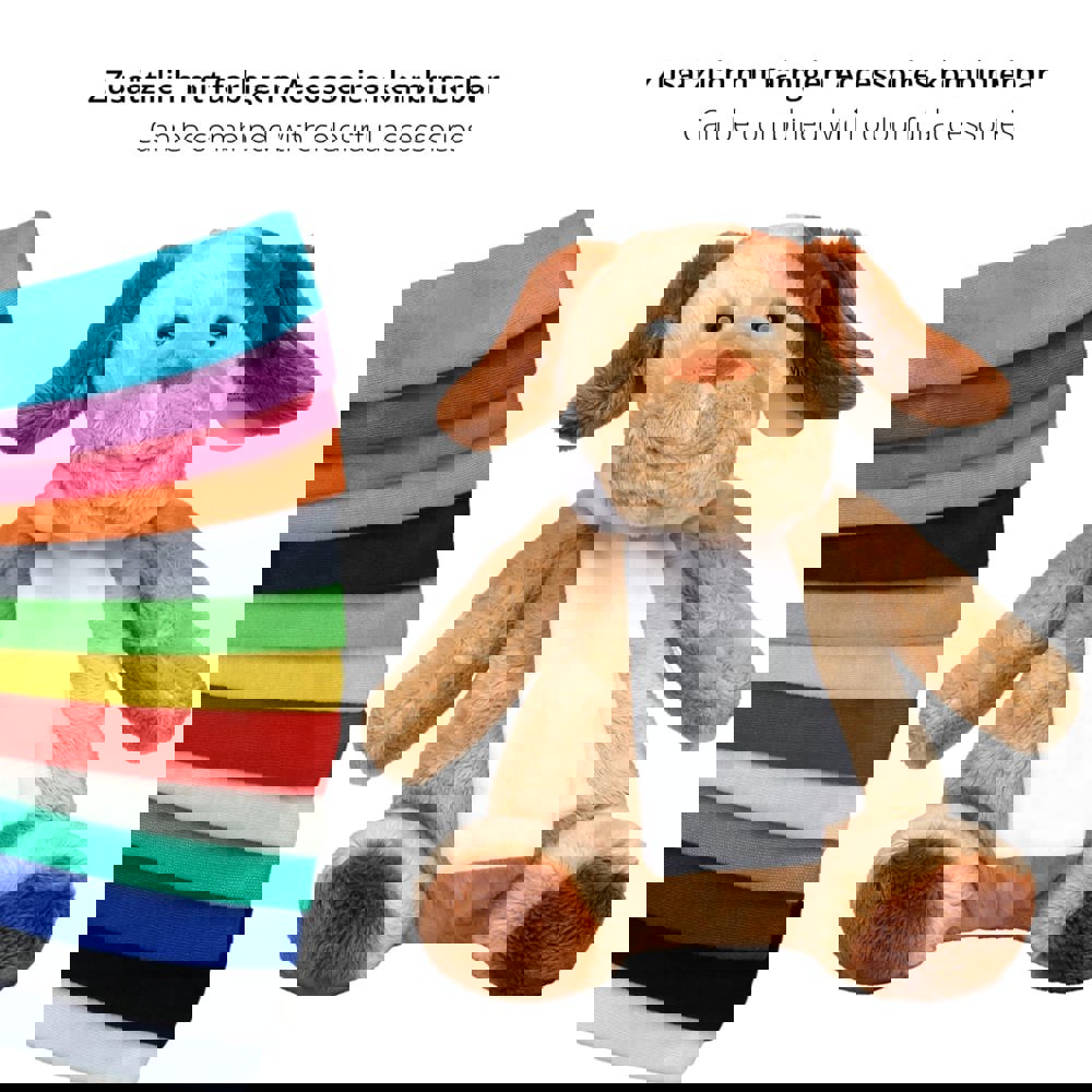 Unser schmuseweicher OEKO-TEX® Hund Helge schafft mühelos sein Upgrade vom Haus- und Hoftier zum nachhaltigen Kuschelhelden für Kinder und Erwachsene und bringt nachhaltige Werbung in Kinder- und Schlafzimmer. Für Logoanbringung oder Werbung existieren vielfältige Möglichkeiten, neben angenähten Domings oder einer Werbefahne auch bedruckbare Mode und Accessoires für Kuscheltiere wie T-Shirts, Dreieckstücher und Schals.