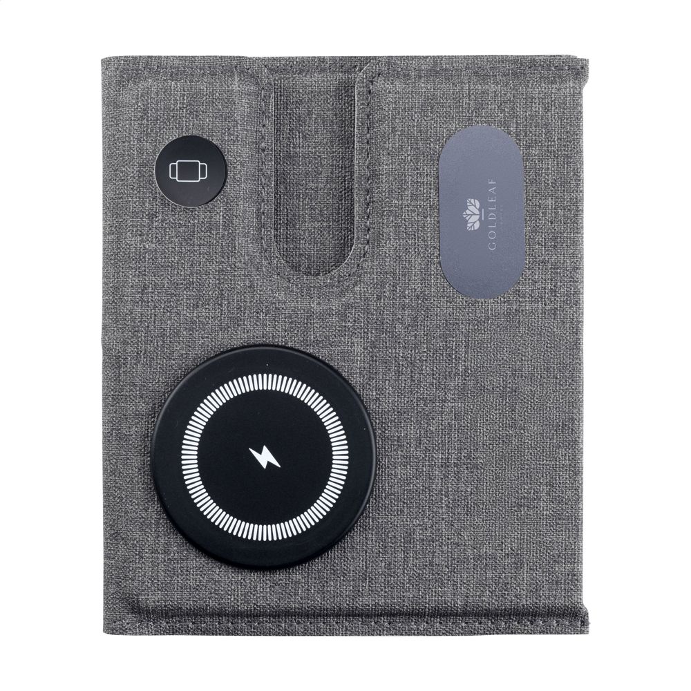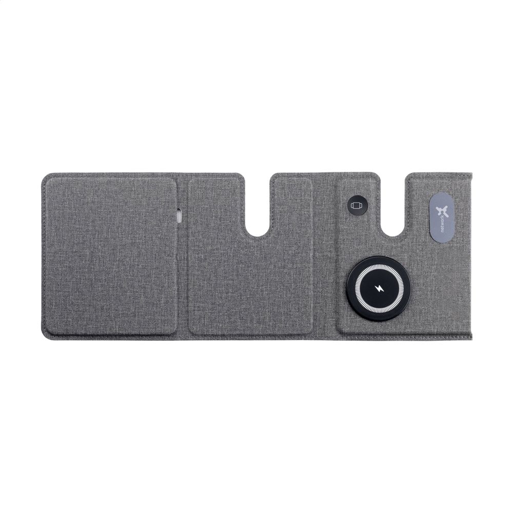 Magnetisches, kabelloses 3-in-1-Ladegerät (15 W) aus recyceltem ABS und recyceltem PU mit grauem Mischmuster. Diese Ladestation unterstützt schnelles kabelloses Laden: 15 W für ein Mobiltelefon, 2,5 W für Ihre iWatch und 3 W für TWS-Kopfhörer. Eingang: 1 x USB-C 9V/3A. Das eingebaute, magnetische Schnellladegerät ist mit allen Geräten kompatibel, die kabelloses Laden nach Qi unterstützen. Stellen Sie diese Dockingstation auf Ihren Schreibtisch und Ihr Arbeitsplatz bleibt aufgeräumt und Ihre Geräte geladen. Zusammenklappbar und leicht zu transportieren. Inklusive USB-C/USB-C-Ladekabel und Gebrauchsanweisung. RCS-zertifiziert. Gesamtes recyceltes Material: 49%. Verpackt pro Stück.