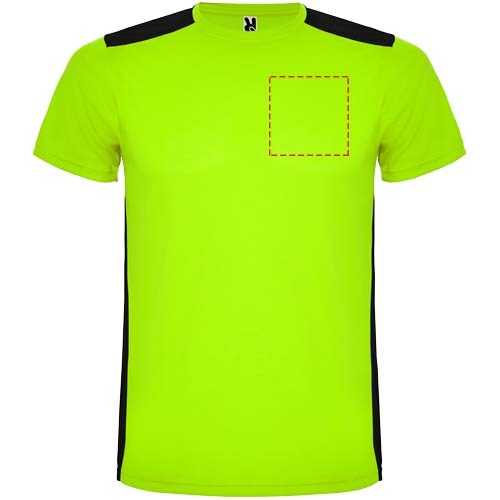 Funktions-T-Shirt aus atmungsaktivem Stoff. Rundhalsausschnitt. Kombination aus zwei Polyestergeweben im Rücken- und Schulterbereich. Polyester Bienenwabe Vorne und 3D-Netz Polyester auf Schulter und Rücken. Material ist feuchtigkeitabsorbierend. Ziernähte auf den Schultern und Seiten. Schnitt mit verlängertem Rückenteil. Abnehmbares Etikett.