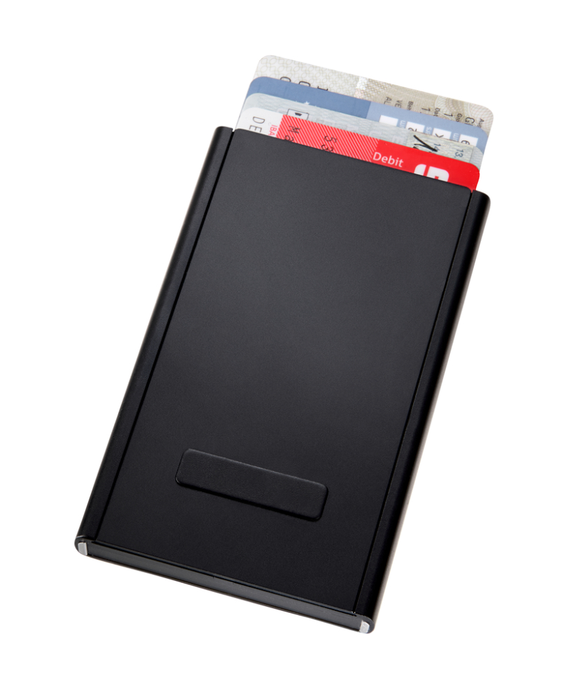 Kartenetui MagSafe, Etui für bis zu sechs Karten (Führerschein, Ausweis, Kreditkarte, usw.), geheimer Schiebemechanismus auf der Front, RFID Schutz (Ausleseschutz), starker Magnet (N52) auf der Rückseite zum Befestigen am Handy, zusätzlicher selbstklebender MagSafe Metallring mit 3M Klebefläche zur individuellen Befestigung, z.B. an allen gängigen Smartphones, Hüllen, Notizbüchern, etc., Aluminium, schwarz