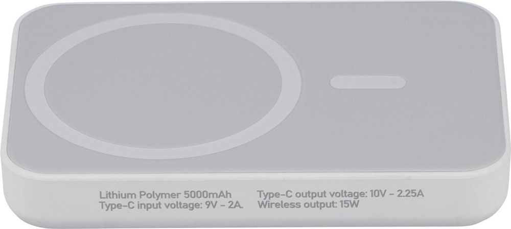 Recycelte ABS-Powerbank verfügt über ein kabelloses Ladegerät, einen 5.000-mAh-Li-Ionen-Akku und einen 15-W-magnetischen kabellosen Ladeausgang (MagSafe-kompatibel). Der Typ-C-Eingang unterstützt bis zu 20 W und der Typ-C-Ausgang DC5V/3A, DC9V/2,22A und DC12V/1,67A. Sie ist mit einem Überhitzungs-, Kurzschluss-, Überspannungs- und Überstromschutz ausgestattet. Sie schaltet sich bei Überhitzung automatisch ab. Sie enthält einen zusätzlichen Metallring mit Kleberückseite, um das kabellose Laden von Nicht-MagSafe-Geräten zu unterstützen. An der Seite befindet sich ein Etikett mit dem Recycled ABS (RABS)-Logo. Sie ist einzeln verpackt in einem braunen Karton mit Seidenpapier im Inneren.