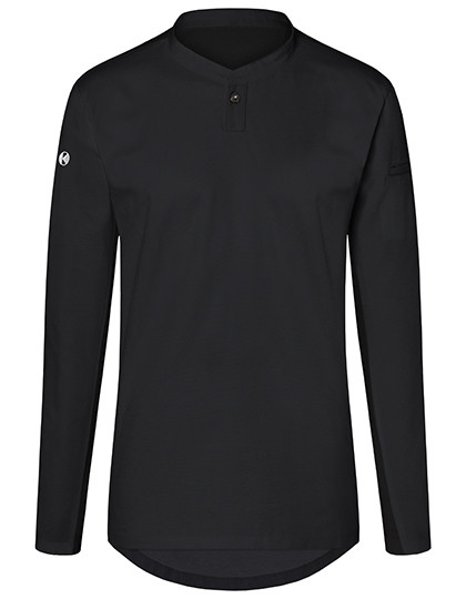 Vorderseite: Köpergewebe | Rückseite: Jersey-Piqué, atmungsaktiv, feuchtigkeitsregulierend | Lange Ärmel | Tailliert geschnitten | Halsausschnitt mit schmalem Stehkragen und kleiner Knopfleiste | Leistentasche am linkem Ärmel