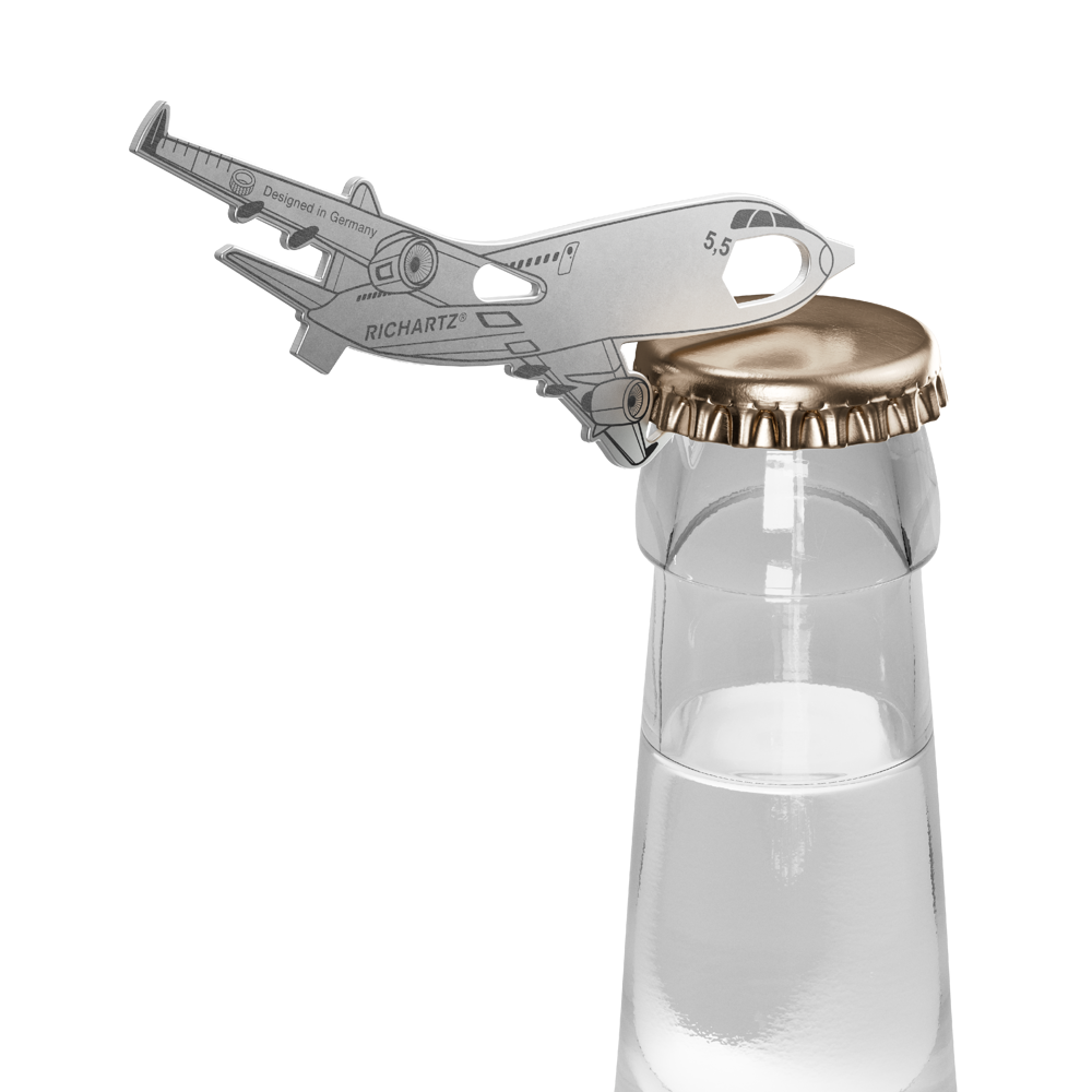 Aus der Familie der SHAPE TOOLS stammt diese Variante in Flugzeugform - und bietet all denen, die am Boden bleiben müssen, einen smarten Helfer für den entspannten Alltag. SHAPE TOOL plane öffnet Flaschen und bringt 5 weitere Funktionen für jeden Tag mit.